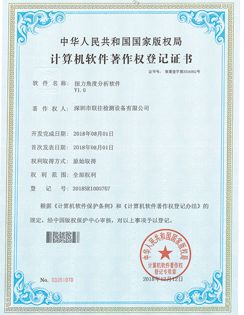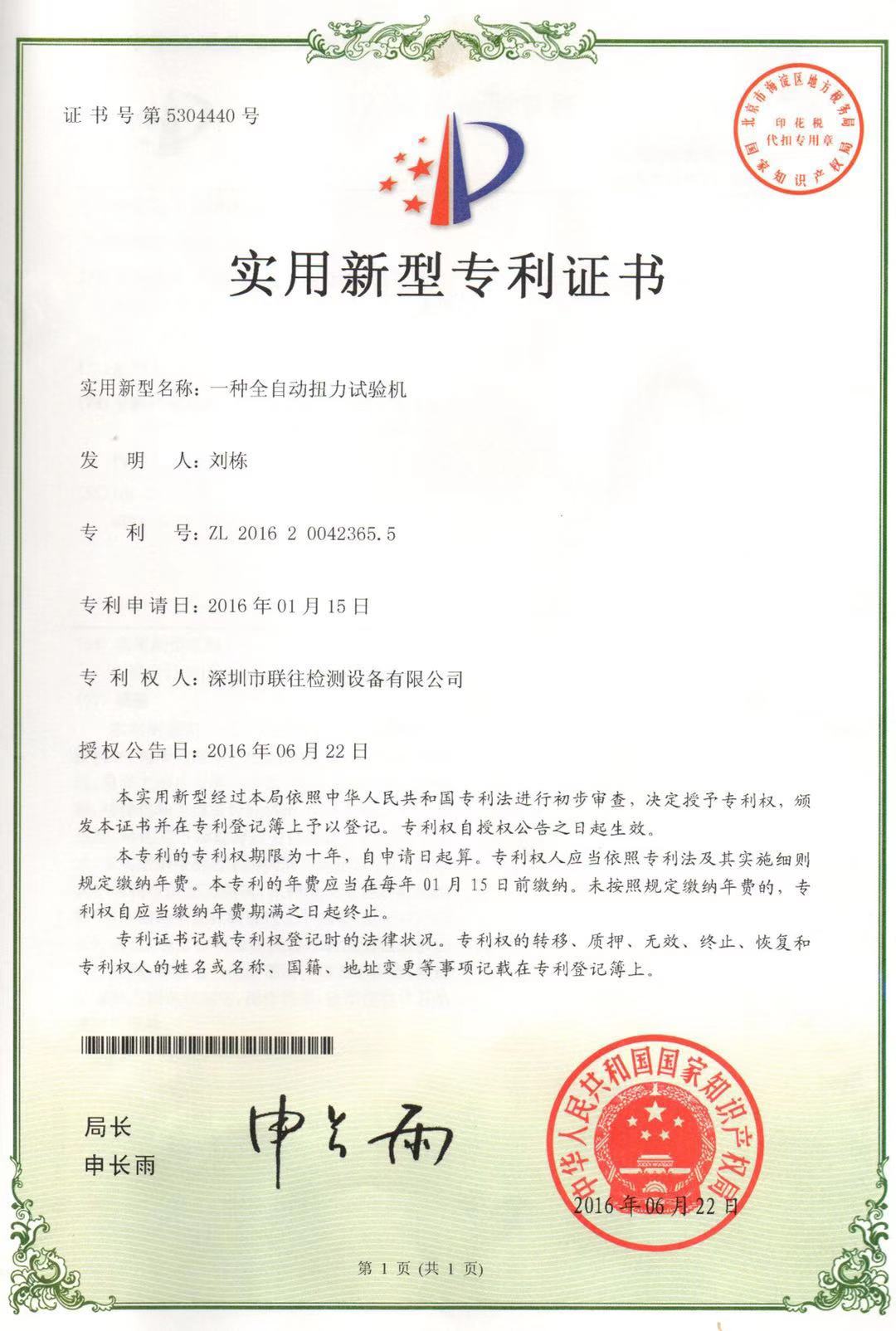 扭力试验机专利证书