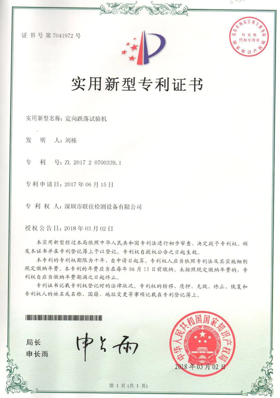 定向跌落试验机专利证书